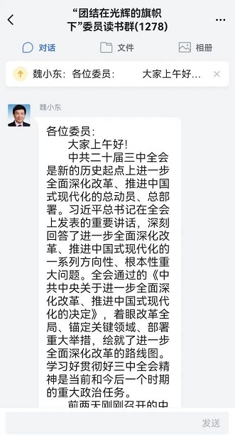 为促进委员进一步深入领会中共二十届三中全会精神,市政协在前期学习的基础上,于9月2日至21日,在市政协委员履职平台“京华书院·团结在光辉的旗帜下”读书群开展“学习贯彻中共二十届三中全会精神”专题读书研学活动。市政协主席魏小东作开篇领学,各位副主席分别围绕各专题内容领学,各专委会轮流组织,全体委员在线上交流学习体会和感悟。