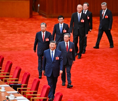 中国共产党第二十届中央委员会第三次全体会议,于2024年7月15日至18日在北京举行。这是习近平、李强、赵乐际、王沪宁、蔡奇、丁薛祥、李希等步入会场。(岳月伟 摄)
